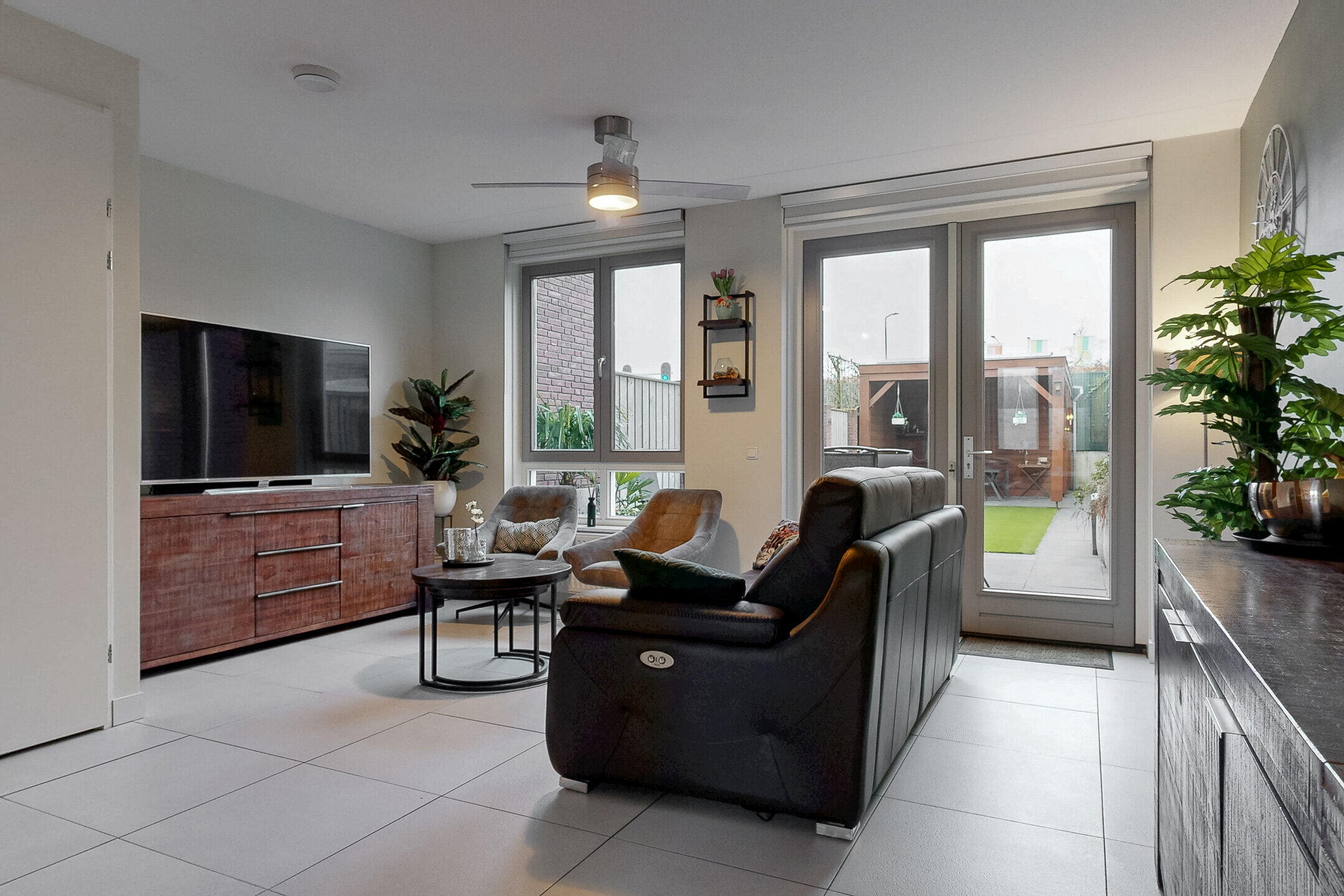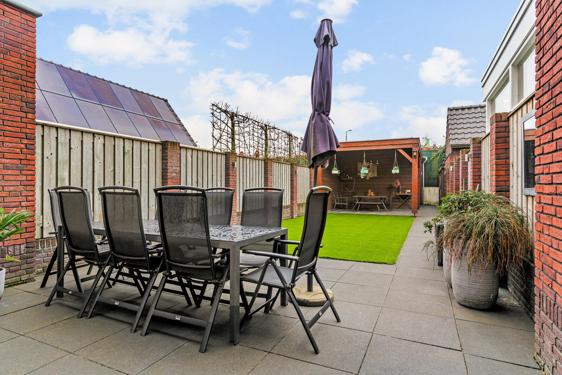 De achtertuin is gelegen op het zuiden en is onderhoudsvriendelijk aangelegd met kunstgras, wat zorgt voor een strak, groen geheel en minimaal onderhoud. Er is voldoende ruimte voor een terras, loungehoek en speelplek.