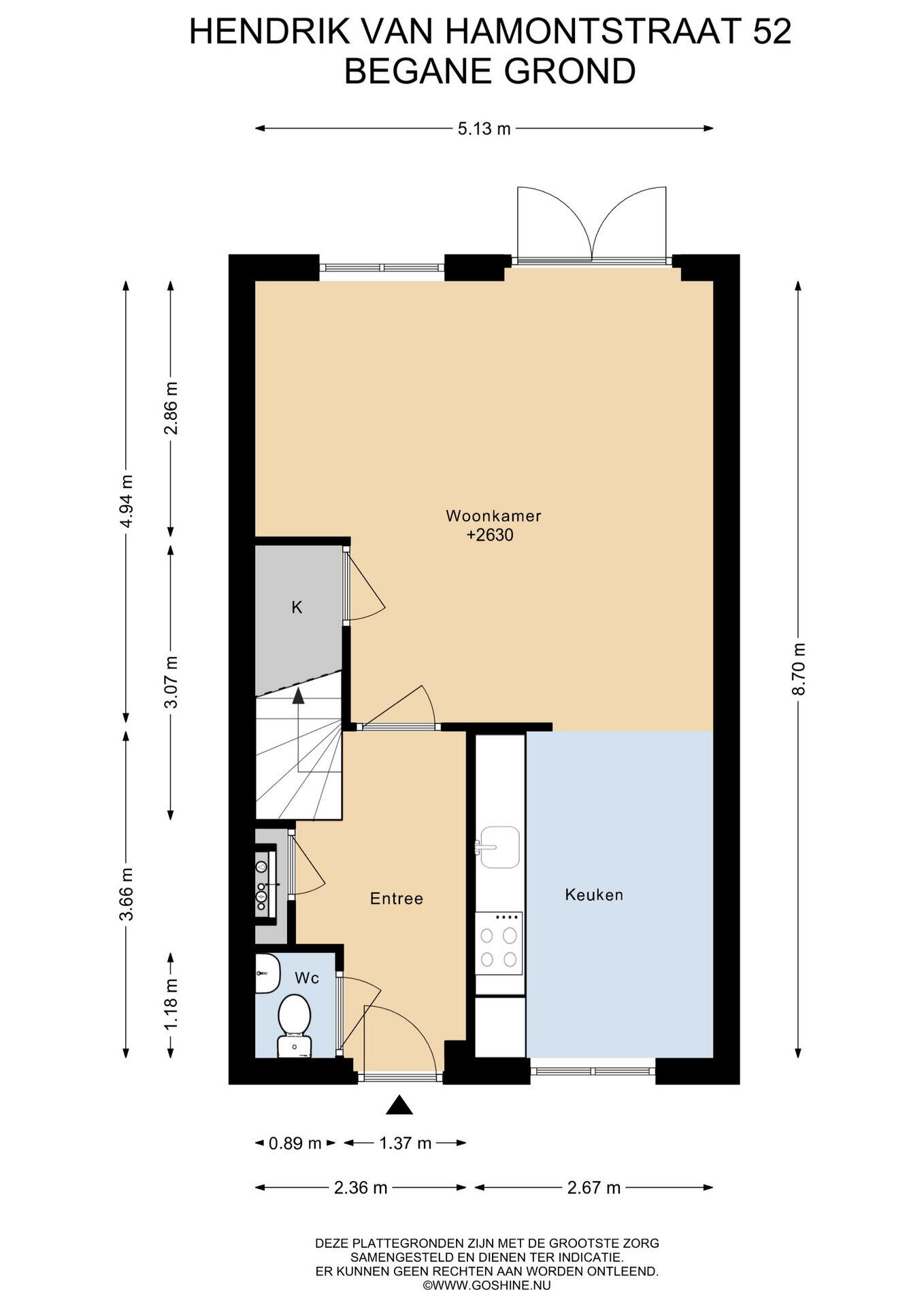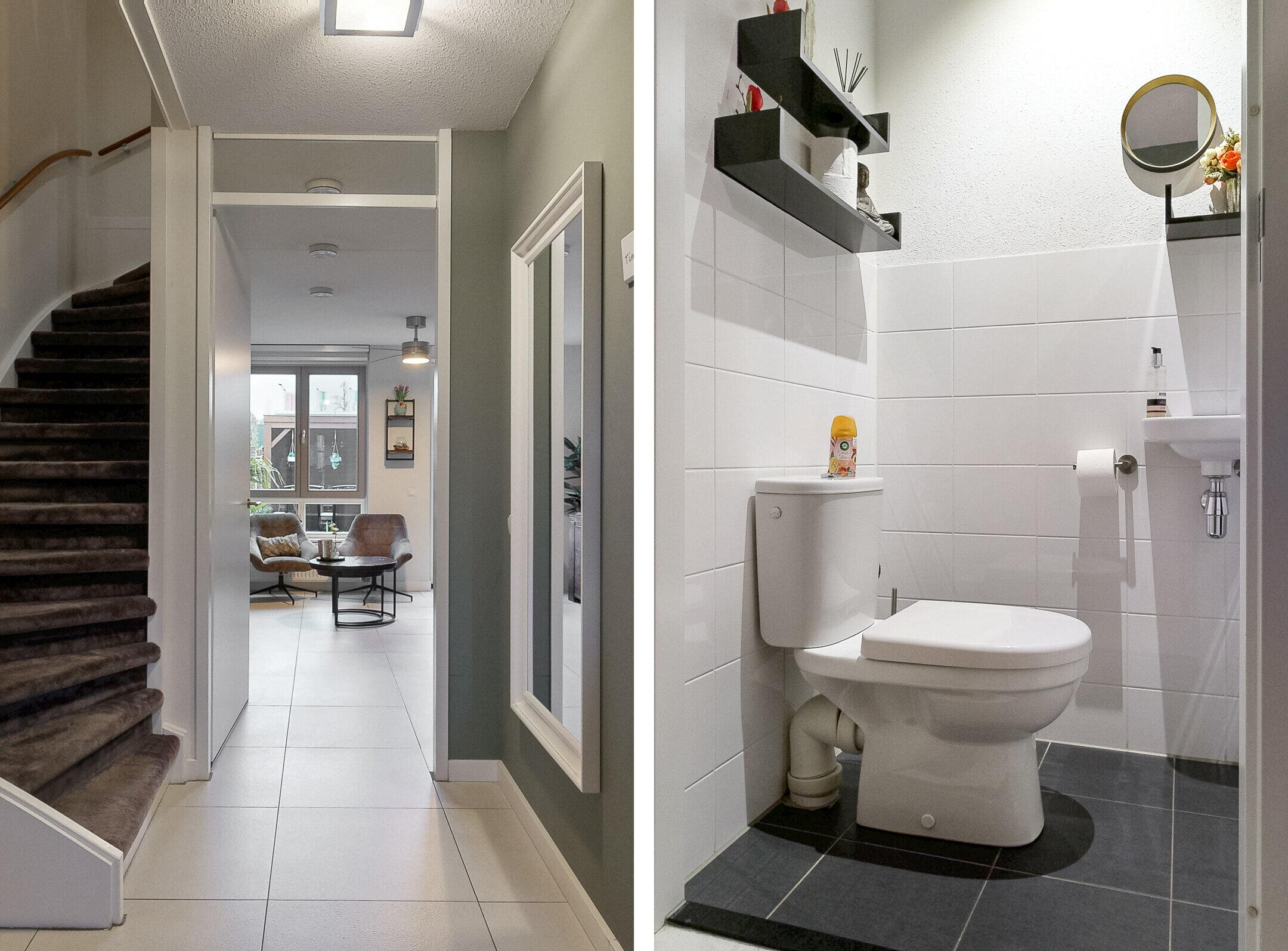 Via de voortuin bereik je de entree van de woning. In de hal bevinden zich het toilet met fonteintje, de meterkast en de trapopgang naar de verdiepingen. De hal geeft toegang tot de woonkamer.